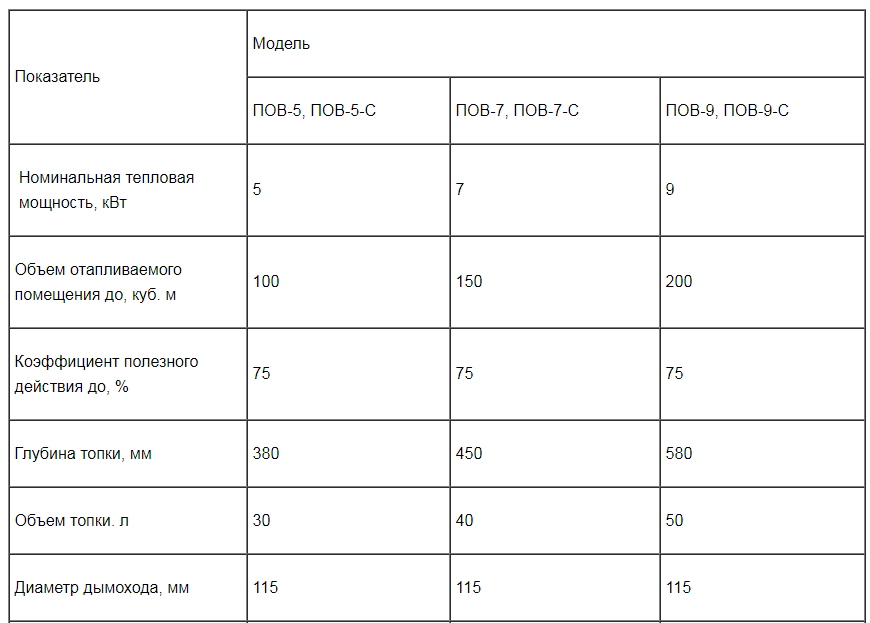 Серийно выпускаются модели печи «ПОВ -5», «ПОВ -5-С», «ПОВ-7», «ПОВ-7-С», «ПОВ-9», «ПОВ -9-С» рассчитанные на помещение от 100 м3 до 200 м3, мощностью от 5 кВт до 9 кВт.