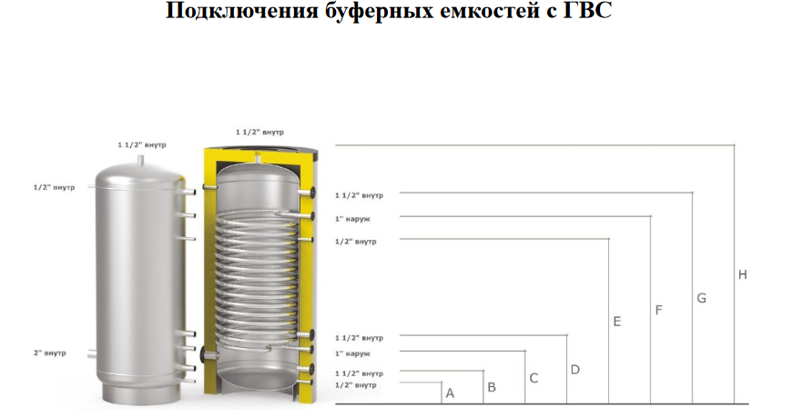 Буферная ёмкость (бак-аккумулятор с контуром ГВС) - это теплоаккумулятор с дополнительным контуром горячего водоснабжения внутри. Отличие от бойлера горячего водоснабжения состоит в том, что в бойлере теплоноситель идёт по змеевику, а весь объём бойлера заполнен санитарной водой, а в баке-аккумуляторе наоборот, теплоноситель занимает весь объём бака, а санитарная вода находится в змеевике (пример: в бойлере это будет 300 литров горячей чистой воды, а в баке-аккумуляторе – 300 литров теплоносителя и всего несколько литров чистой воды в проточном теплообменнике, т.е. в данном случае горячее водоснабжение — это дополнительная функция теплоаккумулятора).