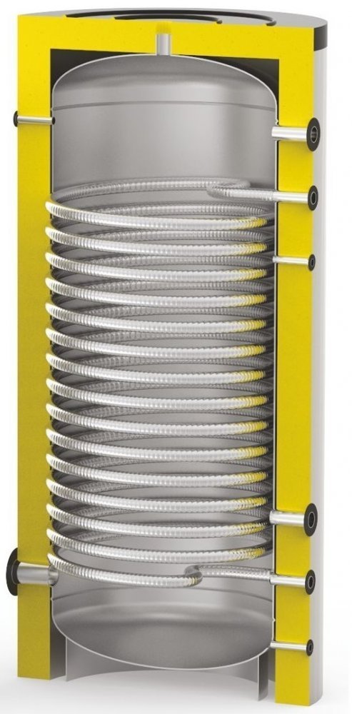 Буферная ёмкость (бак-аккумулятор с контуром ГВС) - это теплоаккумулятор с дополнительным контуром горячего водоснабжения внутри. Отличие от бойлера горячего водоснабжения состоит в том, что в бойлере теплоноситель идёт по змеевику, а весь объём бойлера заполнен санитарной водой, а в баке-аккумуляторе наоборот, теплоноситель занимает весь объём бака, а санитарная вода находится в змеевике (пример: в бойлере это будет 300 литров горячей чистой воды, а в баке-аккумуляторе – 300 литров теплоносителя и всего несколько литров чистой воды в проточном теплообменнике, т.е. в данном случае горячее водоснабжение — это дополнительная функция теплоаккумулятора).