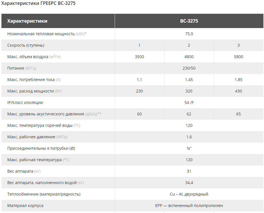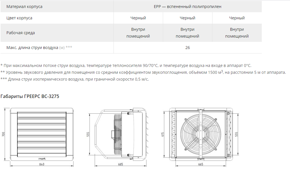 Тепловентилятор ГРЕЕРС ВС-3275 предназначен для отопления складских помещений, производственных комплексов, торговых помещений, подземных паркингов, спорткомплексов, сельскохозяйственных объектов, теплиц и автомоек. Модель оснащена встроенным трехскоростным двигателем и монтажной консолью. Корпус выполнен из вспененного полипропилена (ЕРР), благодаря чему гарантируется прочность и защита от химических веществ.).