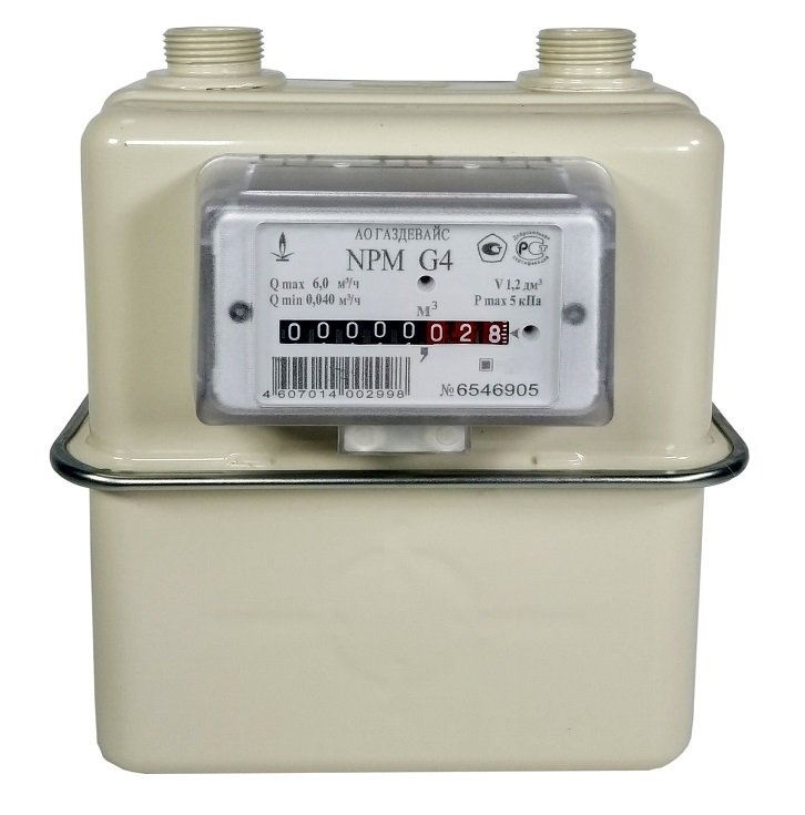Бытовой счетчик газа мембранного типа NPM типоразмера G-4 используется для учета расхода газа в ЖКХ и быту. Принцип действия мембранных моделей основывается на перемещении подвижных мембран. Поток газа вызывает движение и через редуктор и систему рычагов приводится в движение счетный механизм.