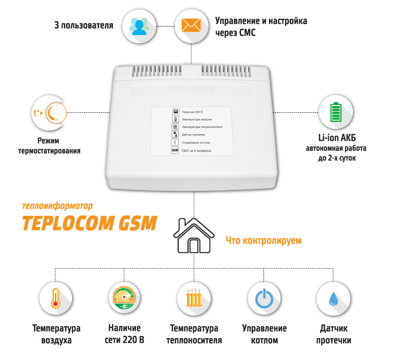 Контроль наличия 220 В, контроль комнатной температуры, контроль температуры теплоносителя, датчик протечки, релейный выход для управления котлом отопления.Тревожные СМС на 3 номера телефонов при пропадании 220 В, попадании воды под датчик протечки, понижении температуры ниже пороговых значений. Запрос текущих параметров звонком. Встроенный аккумулятор на 2 суток автономной работы, сетевой адаптер в комплекте. Не требует настройки и программирования — информатор готов к работе сразу после установки сим-карты. ПО на Android.