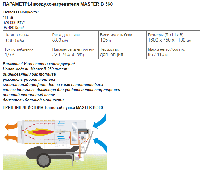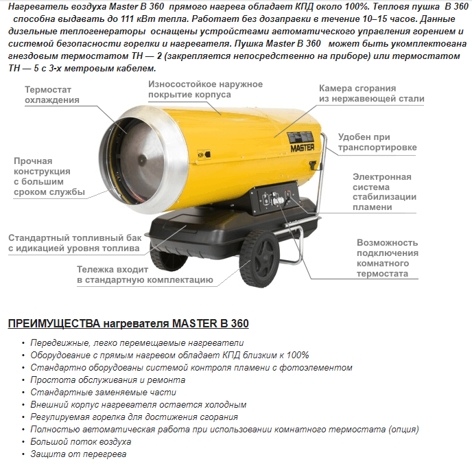 Лаборатория света и тепла » Отопительное оборудование » Тепловые пушки, горелки и нагреватели » Тепловые пушки прямого нагрева » Дизельная тепловая пушка прямого нагрева Master B 360