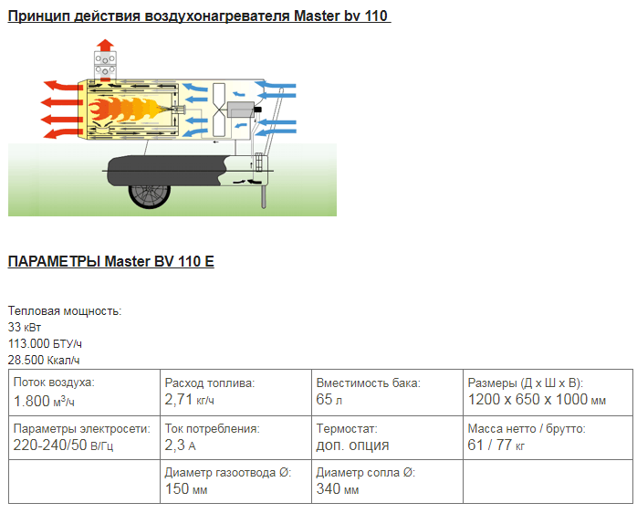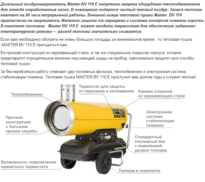 Лаборатория света и тепла » Отопительное оборудование » Тепловые пушки, горелки и нагреватели » Тепловые пушки непрямого нагрева » Дизельная тепловая пушка непрямого нагрева Master BV 110 E