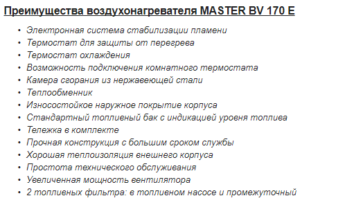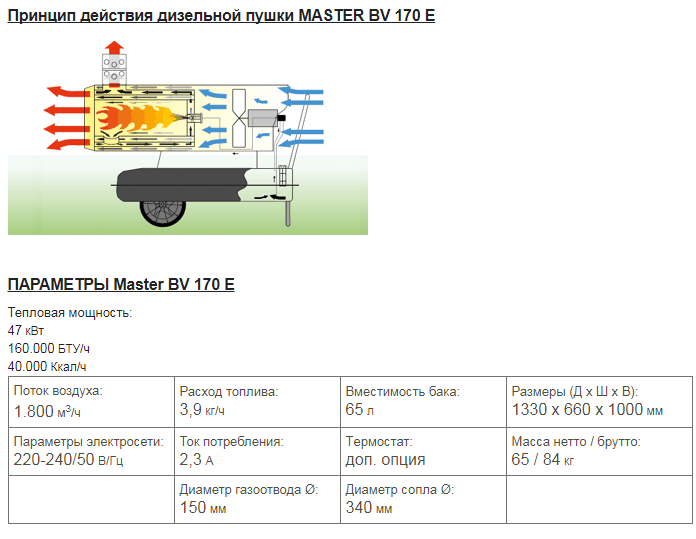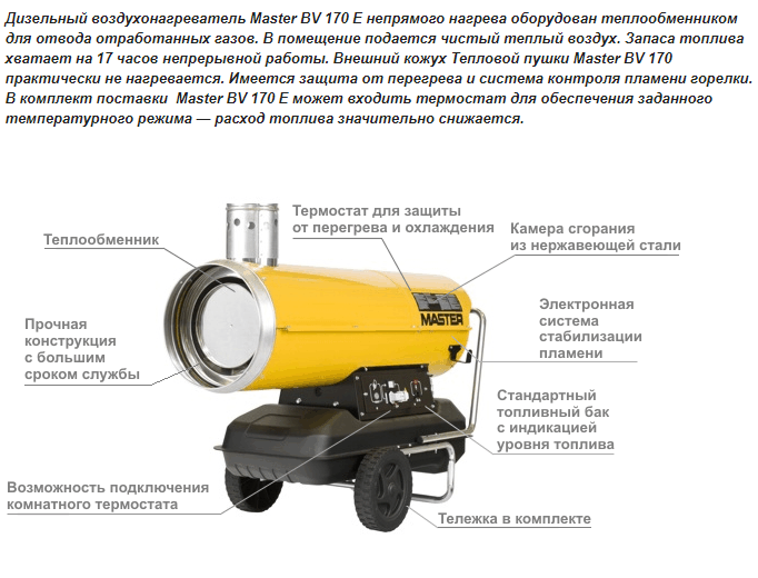 Лаборатория света и тепла » Отопительное оборудование » Тепловые пушки, горелки и нагреватели » Тепловые пушки непрямого нагрева » Дизельная тепловая пушка непрямого нагрева Master BV 170 E