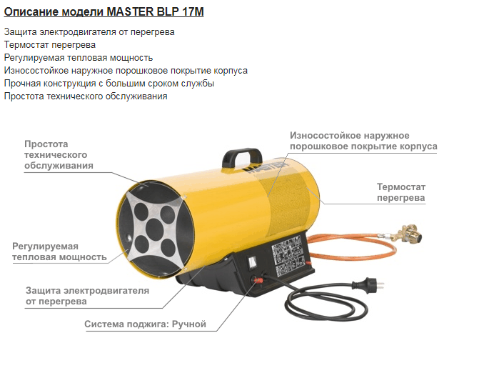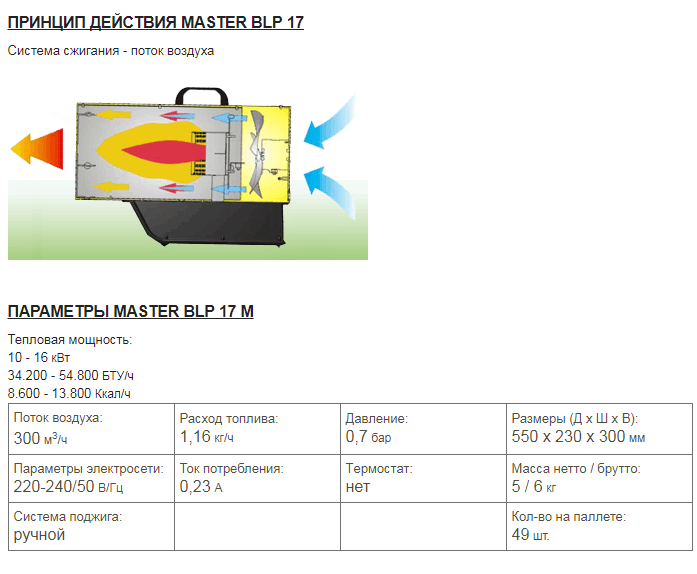 MASTER BLP 17 M. Бездымное сгорание топлива и отсутствие запаха Плавная регулировка мощности нагрева Моментальная готовность к работе Обладает КПД близким к 100%.
