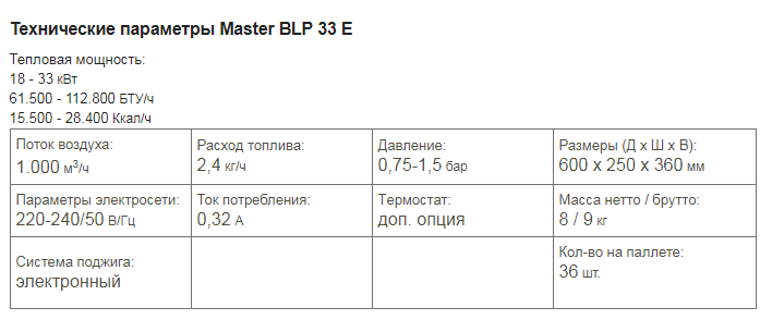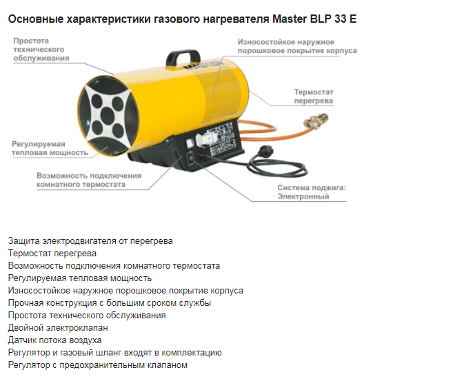 Газовая тепловая пушка Master BLP 33 E обеспечивает бездымное сгорание топлива и отсутствие запаха Плавная регулировка мощности нагрева Моментальная готовность к работе Обладает КПД близким к 100%.