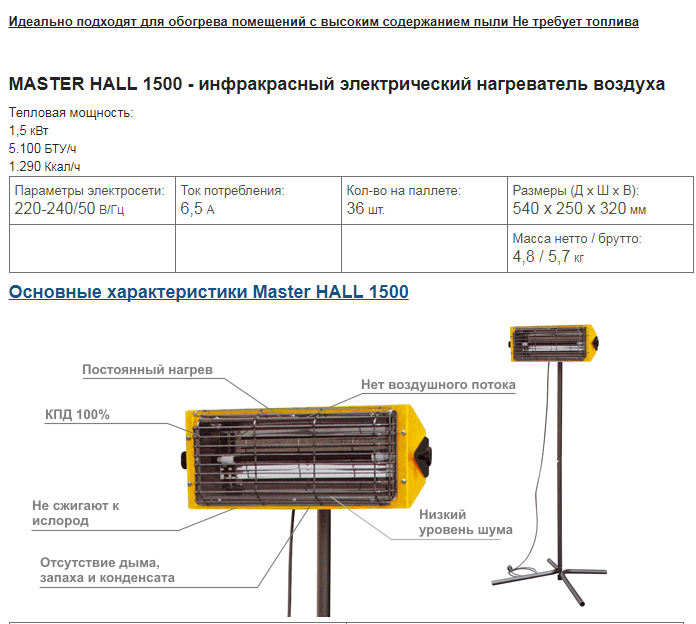 Лаборатория света и тепла » Отопительное оборудование » Тепловые пушки, горелки и нагреватели » Электрические инфракрасные нагреватели » Инфракрасный нагреватель MASTER HALL 1500