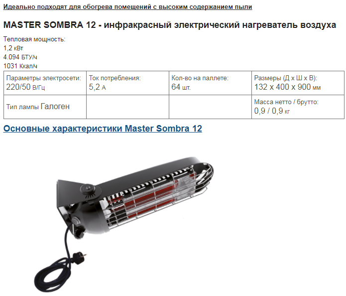 Инфракрасный нагреватель MASTER SOMBRA 12. Идеально подходят для обогрева помещений с высоким содержанием пыли.