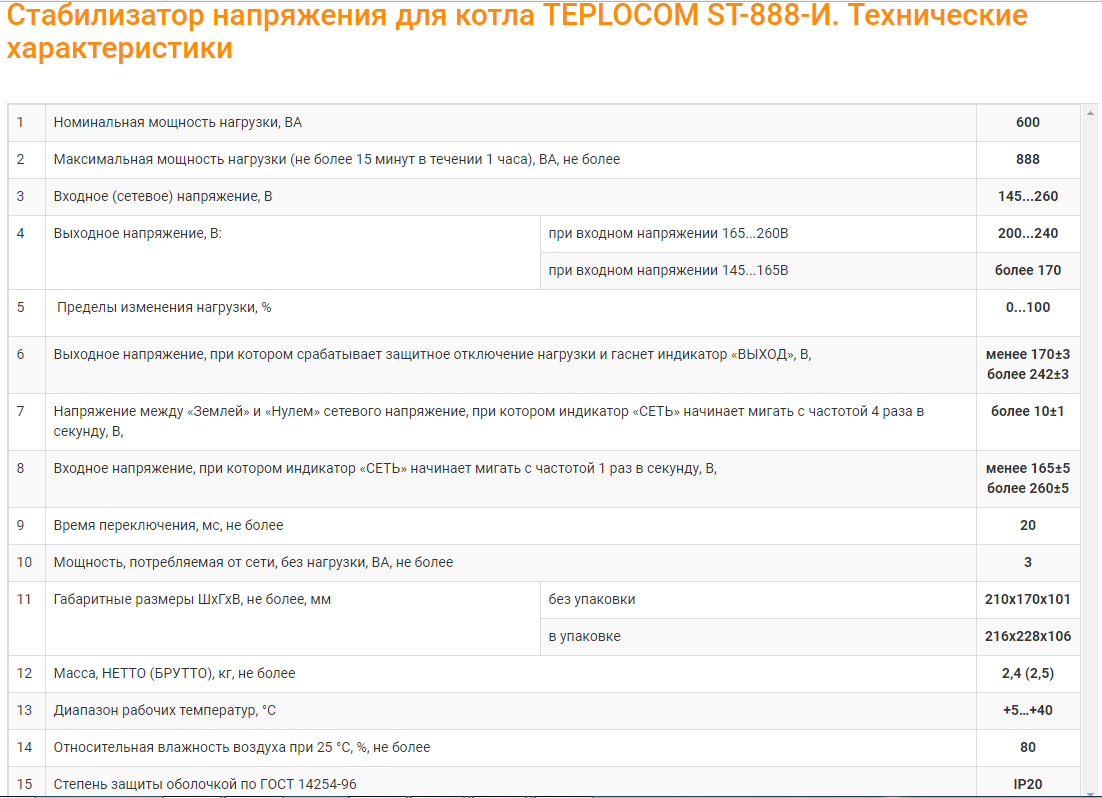 Стабилизатор напряжения для газового котла. Мощность нагрузки 888 ВА, диапазон сети 145—260 В, полная мощность во всем диапазоне сети, стабилизация напряжения вольтдобавочного типа, микропроцессорное управление, защитное отключение при авариях в сети с автоматическим восстановлением, индикация аварийных ситуаций. Обеспечивает проверку и индикацию правильности фазировки и наличия потенциала на «земле», сигнализацию в случае перегорания входного предохранителя. Малогабаритный пластиковый корпус настенного исполнения. Экран индикации напряжения сети. Быстрое и простое подключение (не сложнее удлинителя). Гарантия 5 лет. Застраховано «Ингосстрах» 3 000 000 руб. Рекомендован ведущими мировыми производителями для настенных и напольных котлов.