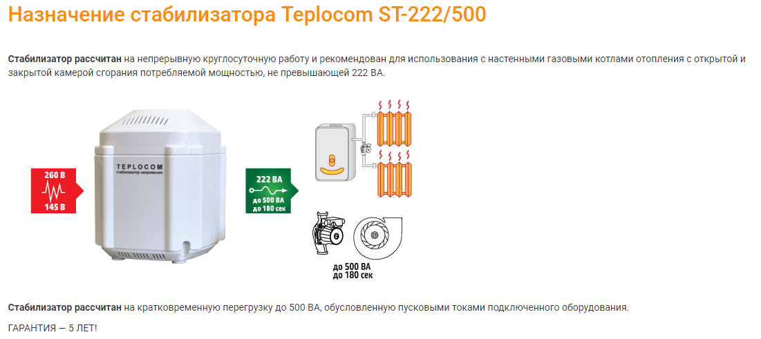 Стабилизатор для газовых настенных котлов отопления с открытой и закрытой камерой сгорания. Мощность нагрузки 222 ВА, кратковременная до 180 сек. перегрузка до 500 ВА — для работы с большими пусковыми токами нагрузки. Диапазон сети 145—260 В, полная мощность во всем диапазоне сети, стабилизация напряжения вольтдобавочного типа, микропроцессорное управление, защитное отключение при авариях в сети с автоматическим восстановлением, индикация аварийных ситуаций. Малогабаритный пластиковый корпус настенного/настольного исполнения. Крепление на стену на ДИН рейку (в комплекте). Розетка интегрирована в корпус. Быстрое и простое подключение (не сложнее удлинителя). Рекомендован ведущими мировыми производителями для настенных котлов. Наилучшее соотношение цена/качество
