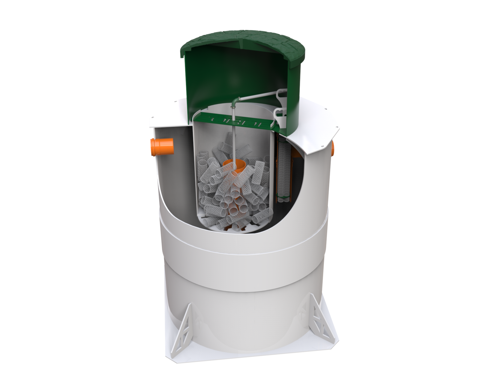 Компактный корпус изготавливается из прочного чешского PP-пластика IMG Bohemia, усилен бандажом и дополнительными крепёжными элементами в основании. Прочная конструкция станции позволяет использовать её в сложных грунтовых условиях, а дно имеет прямоугольную форму и выступает за пределы корпуса, что позволяет отказаться от якорения конструкции в ходе проведения монтажных работ